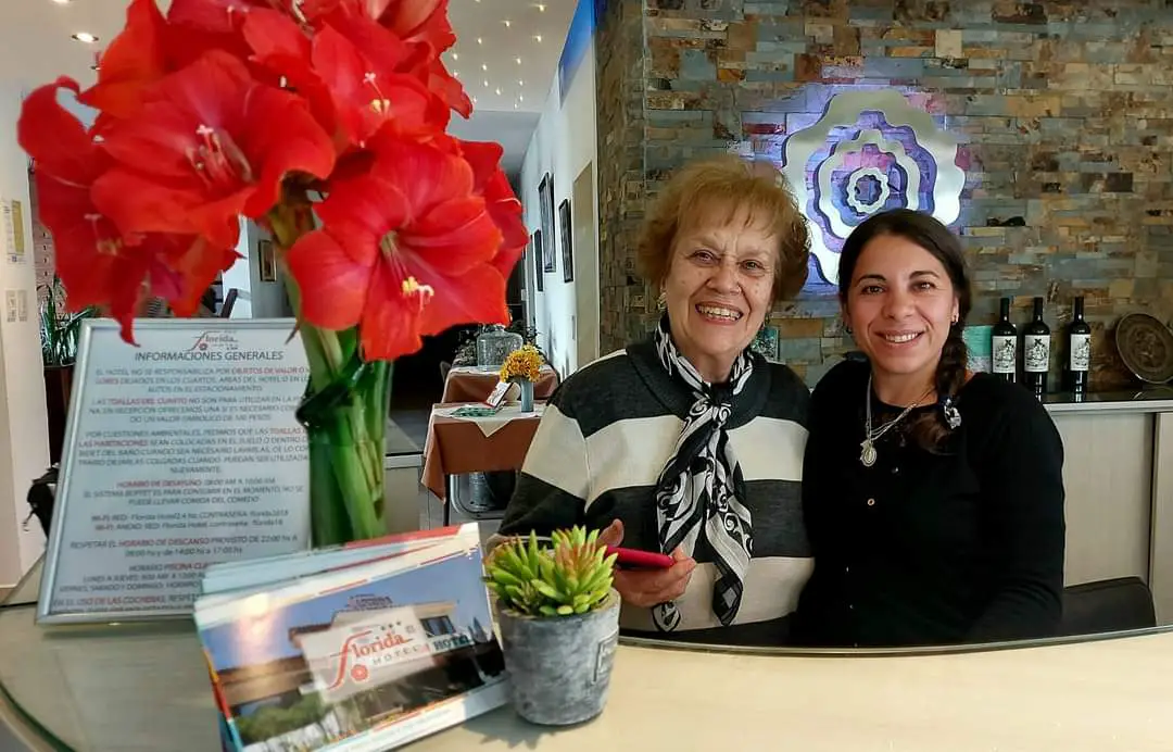 La querida Haydée Morandi posa en la recepción de su coqueto y remozado ‘Florida Hotel & Spa’, junto a la conserje Claudia, en vísperas de un día muy especial para el establecimiento.