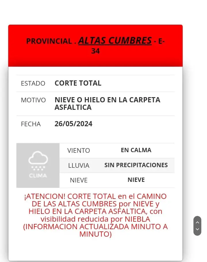 La Policía Caminera informó que continúa cortado el Camino de las Altas Cumbres a raíz de la presencia de hielo y nieve en la carpeta asfáltica y de la escasa visibilidad en algunos tramos de la ruta.