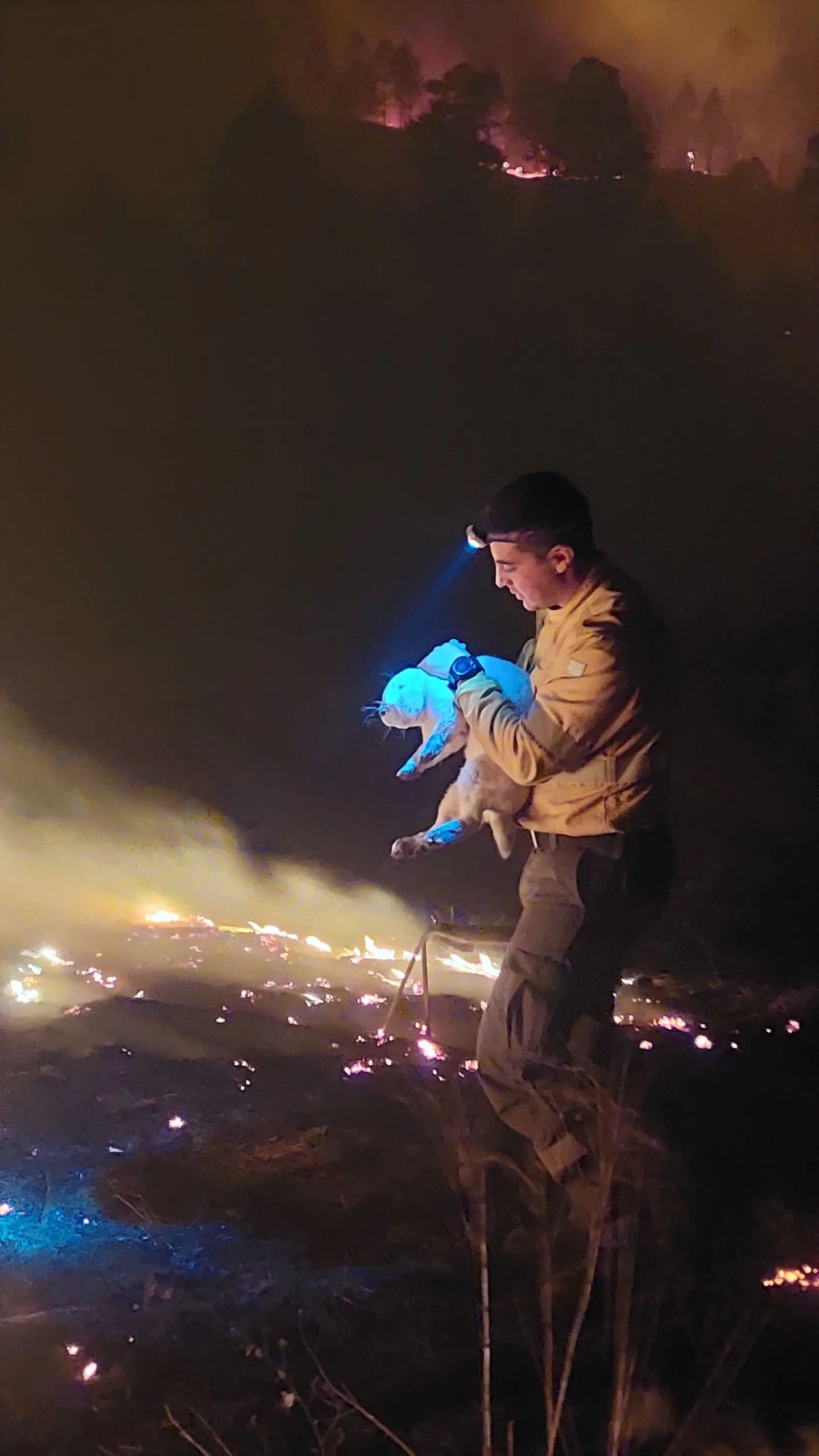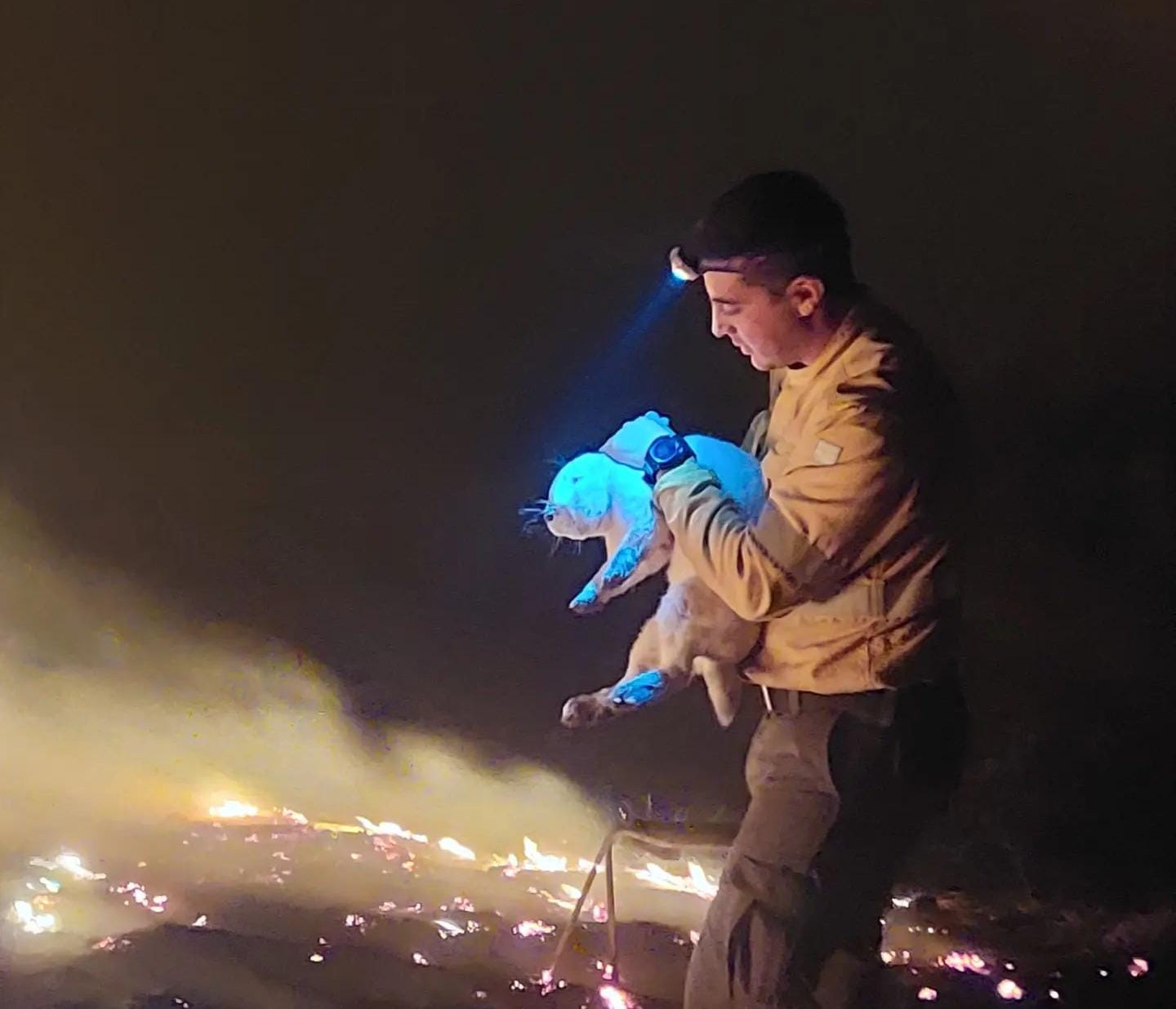 La foto fue tomada en un momento de extrema tensión, cuando José Luis y su equipo llegaron al patio de una casa en medio de la noche. Los corrales estaban llenos de animales de granja, incluyendo gansos y conejos, atrapados y asustados mientras el fuego amenazaba con consumirlo todo. Con su equipo, José Luis logró contener las llamas alrededor de la propiedad, apagar los tanques que ardían, y darles agua a los animales, llevándolos a un lugar seguro.