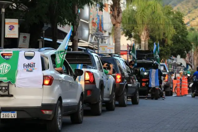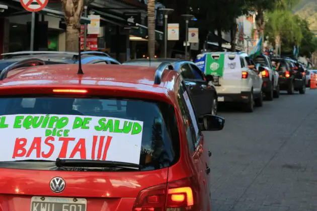El personal de salud del municipio reclama por mejoras salariales con un autazo que recorrió las calles de la ciudad y terminó con un acto en el Playón Municipal.