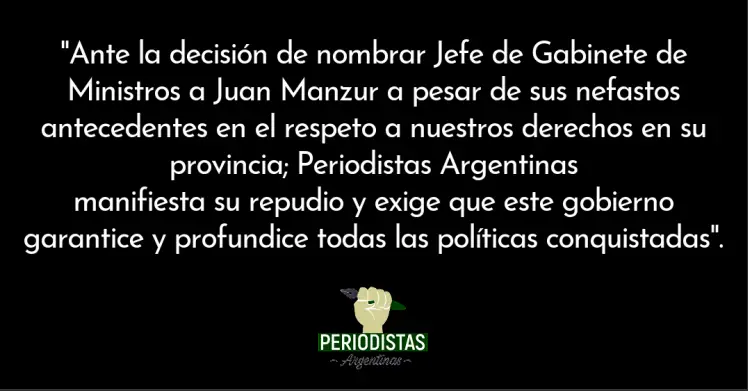 A esta postura se le sumó la de otro colectivo, el de Periodistas Argentina, que manifestaron también su repudio a la designación de Manzur .