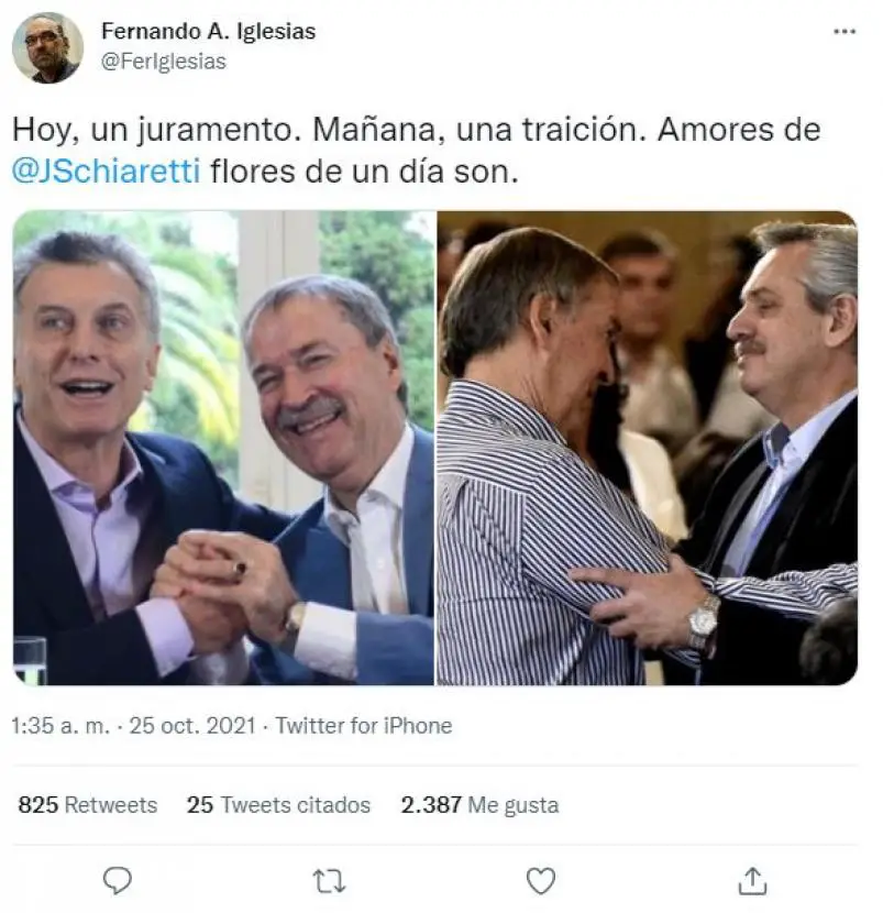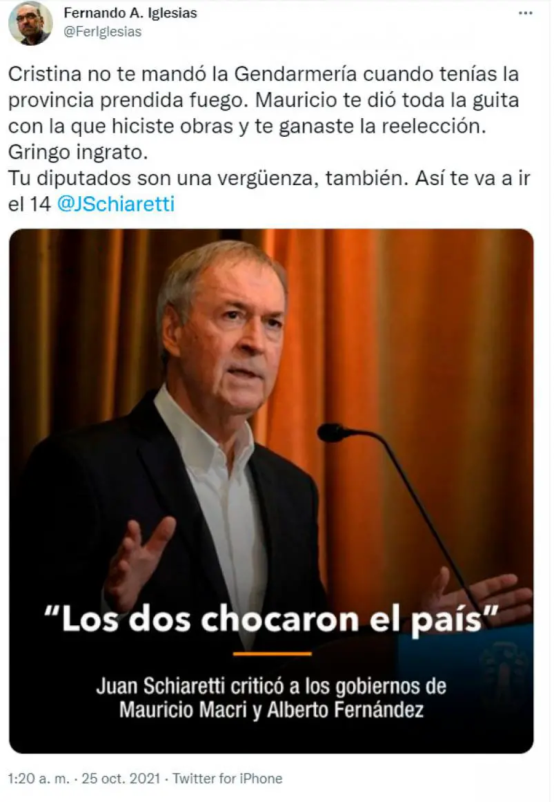 Por su parte, el diputado de la oposición Fernando Iglesias, trató al gobernador de «traidor» y de «ingrato», señalando diferencias entre el kirchnerismo y el macrismo.