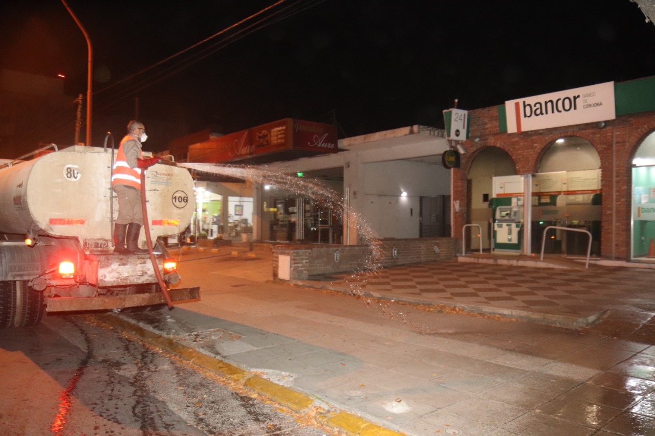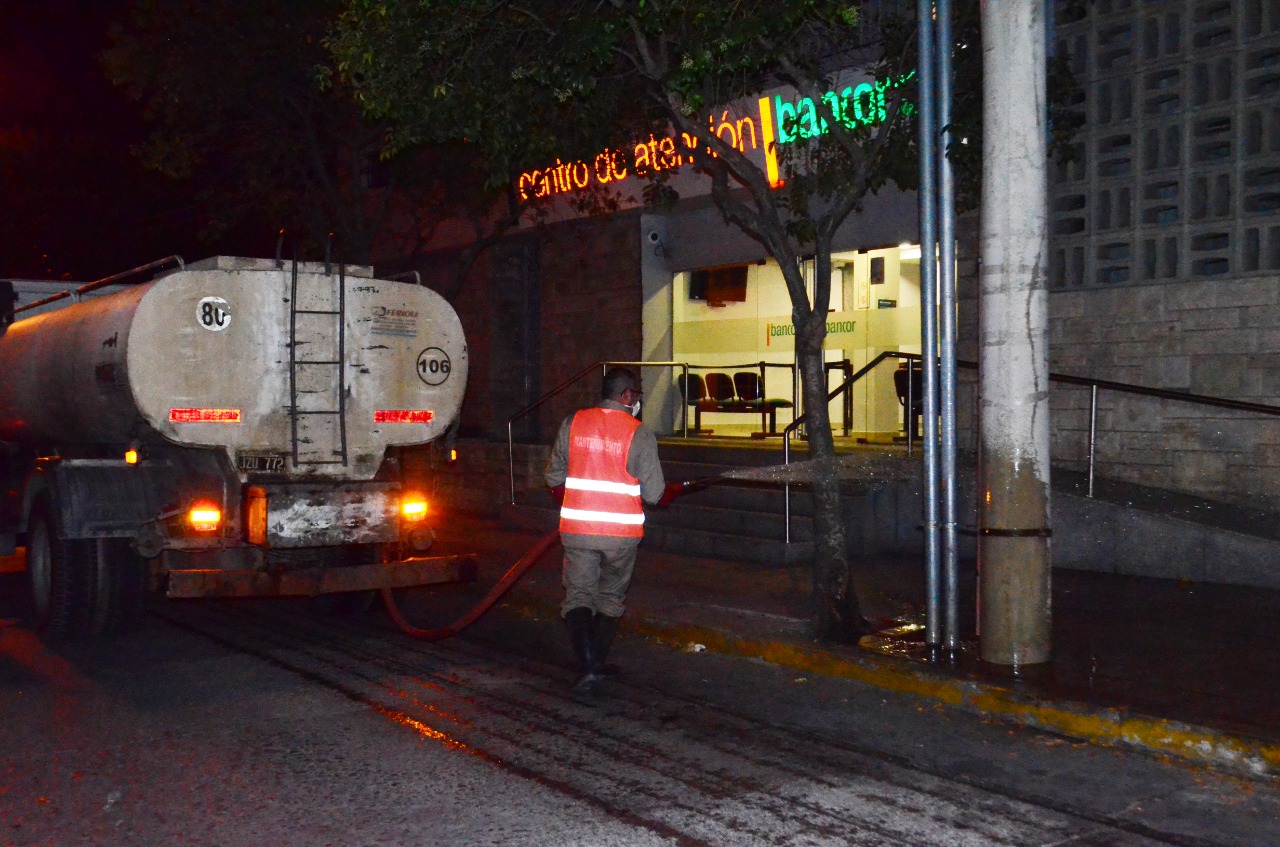 Este miércoles a la noche se llevó a cabo una nueva tarea de desinfección en los puntos críticos en los que mayor aglomeramiento de gente se produce en Villa Carlos Paz.