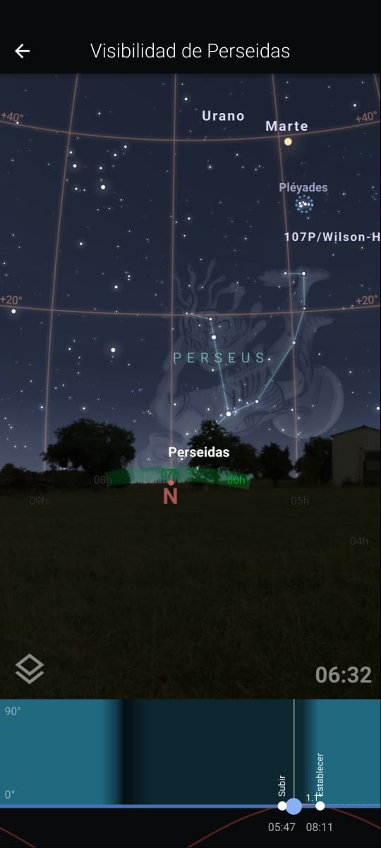El otro fenómeno astronómico es el de las perseidas, lluvia de meteoros. Esto se da cuando La Tierra pasa por la trayectoria que anteriormente hizo un cometa. «Eso se ve en la constelación de Perseo (Perseus en la imagen abajo), las perseidas, que genera mayor actividad en estos fenómenos, que no son más que cuerpos celestes que se precipitan a la atmósfera, combustionan en la termósfera (lo que de da su brillo), y el color, es a causa de la interacción de los iones de su material, con el campo electromagnético de nuestra tierra», concluyó Altimari.