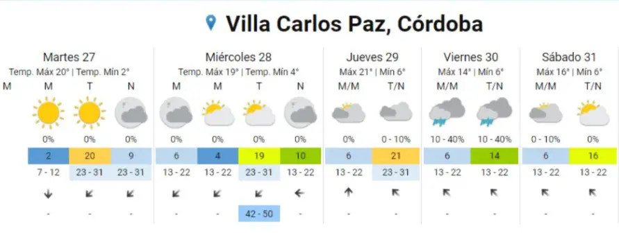 Para el viernes, se espera un cambio en las condiciones climáticas con la posible llegada de la tormenta de Santa Rosa, que podría traer lluvias aisladas y un descenso en las máximas, que no superarían los 14 grados.