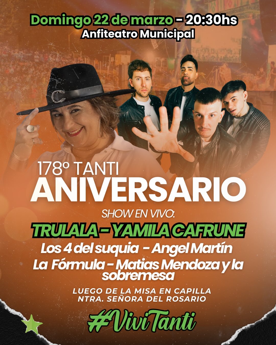 La localidad de Tanti se prepara para vivir un fin de semana cargado de emoción, cultura y tradición con motivo de su 178° aniversario. Bajo el lema de encontrarse y celebrar su historia, se organizó una agenda de tres días con propuestas para toda la comunidad, con entrada libre y gratuita.