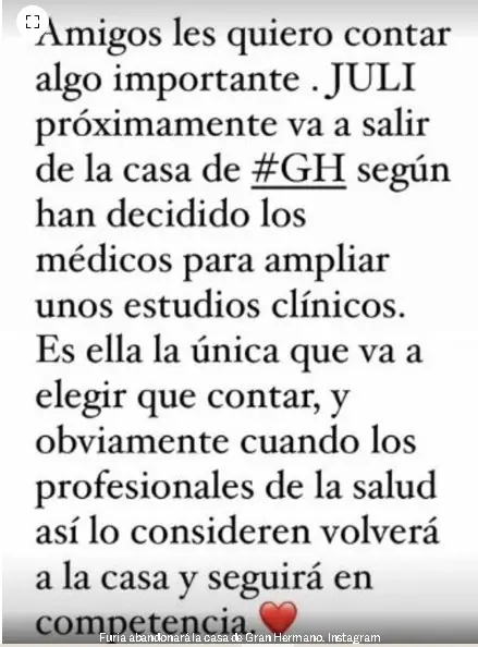 De acuerdo con lo informado por Clarín, Santiago del Moro confirmó en su Instagram que Furia dejará la casa de Gran Hermano por orden del médico. «Amigos quiero comentarles algo importante. Juli próximamente va a salir de la casa de Gran Hermano, según han decidido los médicos para ampliar unos estudios clínicos», comenzó diciendo.