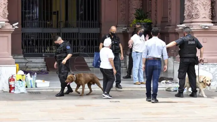 Personal del área de Explosivos de la Policía Federal activó este jueves el protocolo de seguridad en la Casa Rosada, en Balcarce 50, donde desarrolla sus actividades el presidente Alberto Fernández, ante una ama