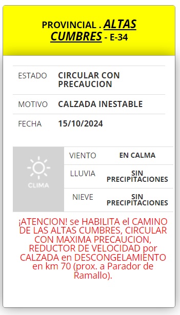El Camino de las Altas Cumbres volvió a habilitarse al tránsito poco después de las 9 de la mañana de este martes, luego de que fuera interrumpido durante la madrugada debido a la fuerte tormenta de granizo que cayó sobre las Altas Cumbres.