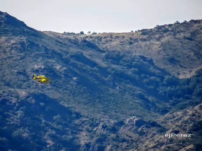 Durante la jornada de este viernes, dos aviones y un helicóptero realizaron pruebas de trabajo sobre fuego en aguas del lago San Roque.