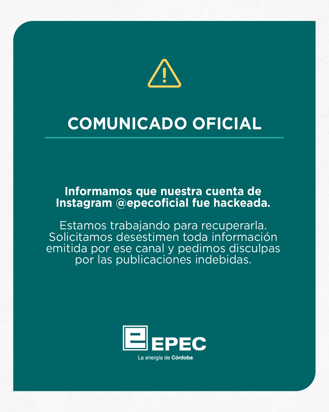 En un comunicado oficial, Epec aclaró: “Nuestra cuenta de Instagram fue hackeada. Estamos trabajando para recuperarla. Solicitamos desestimen toda información emitida por ese canal y pedimos disculpas por las publicaciones indebidas”.