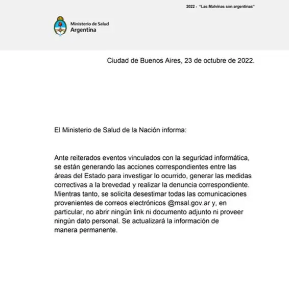 Desde la cartera de Salud emitieron un comunicado en el que hablaron de “reiterados eventos vinculados con la seguridad informática”. Además, informaron que están “generando las acciones correspondientes entre las áreas del Estado para investigar lo ocurrido, generar las medidas correctivas a la brevedad y realizar la denuncia correspondiente”.