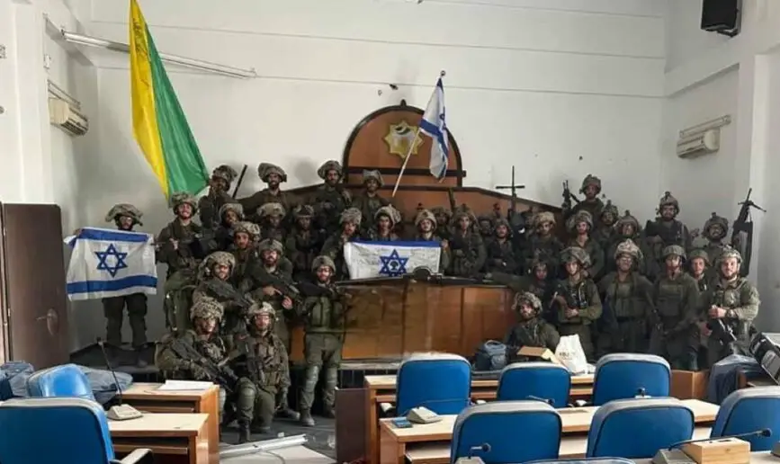 Una imagen que circula por las redes sociales muestra a tropas de la brigada Golani de las Fuerzas de Defensa de Israel (FDI) en el interior del edificio del Parlamento de Gaza, en la ciudad de Gaza, luego de tomar el lugar.