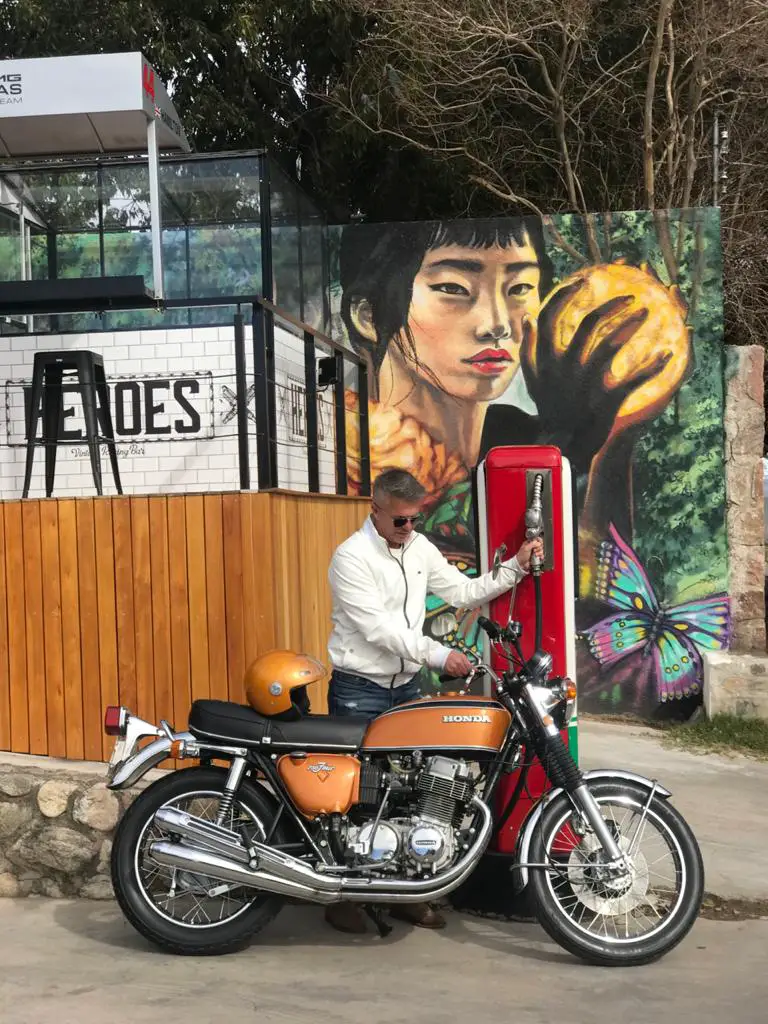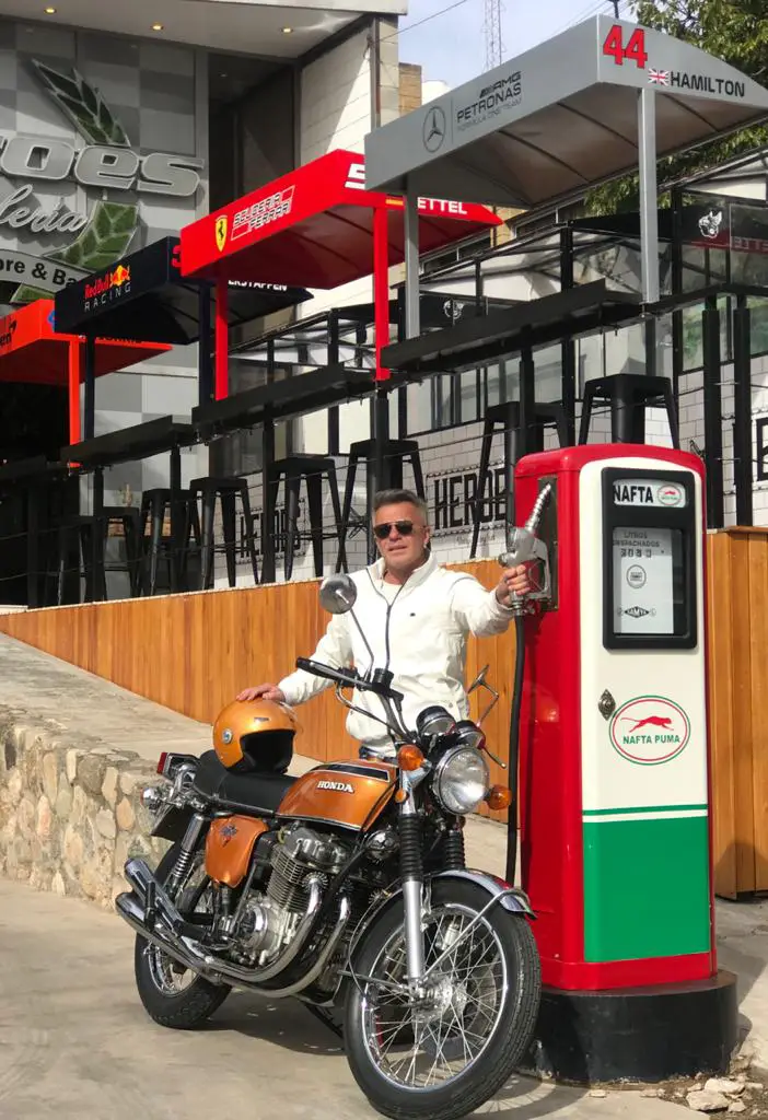 Vichín Rosso aprovechó la oportunidad para llenar su tanque de la Honda Vintage en el surtidor Puma que es todo un ícono ya, del barrio industrial de la Villa.