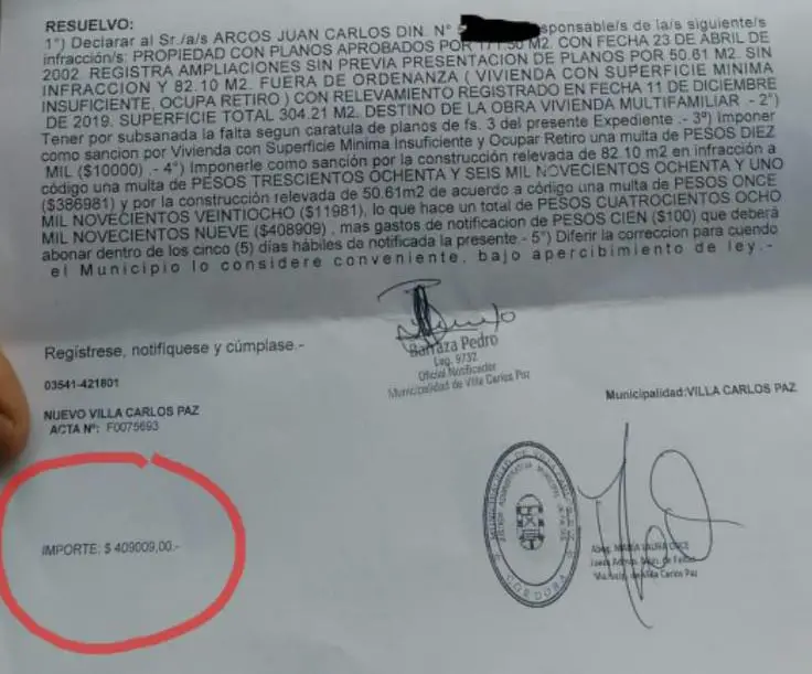 En la notificación se los intimó a pagar la suma en 72 horas o si hacen caso omiso, a demoler la modificación que hicieron.