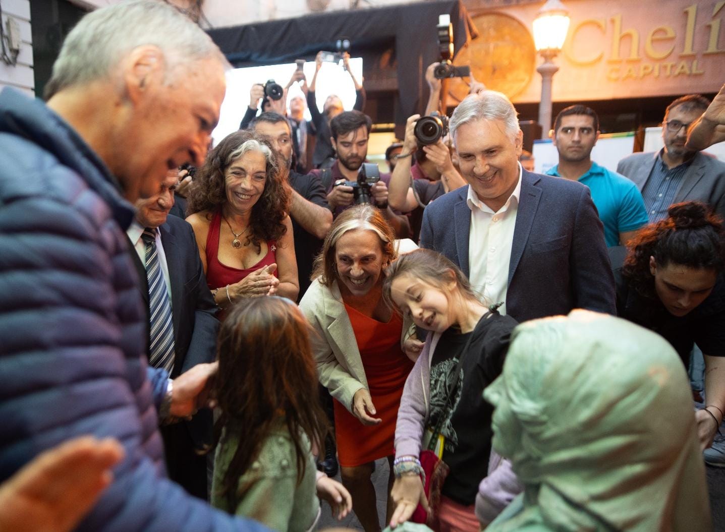 El gobernador Martín Llaryora y el ex mandatario provincial Juan Schiaretti participaron de la ceremonia en la que fue emplazada en la Plazoleta de la Merced la escultura de Sonia Torres, referente de Abuelas de Plaza de Mayo que murió en 2023, a los 94 años, sin encontrar al nieto que buscaba.