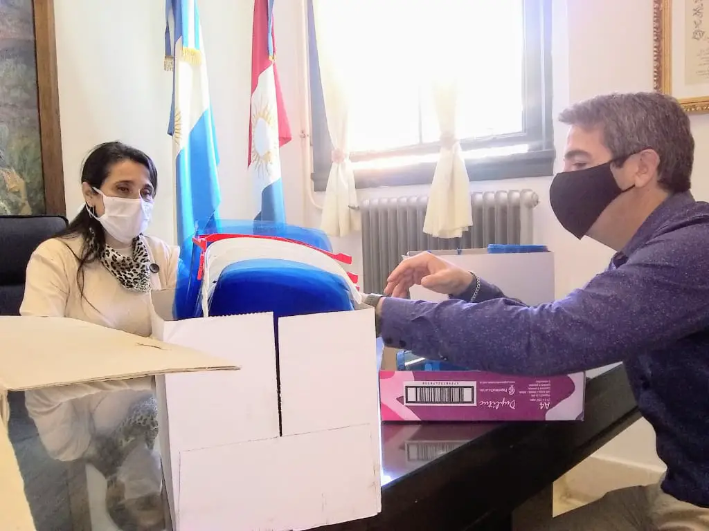 El mandatario fue acompañado por los profesores Carlos Ricci y Ximena Ochoa del IPET 200 “Claudia Gregorat”, quienes estuvieron a cargo de la confección de las máscaras con las impresoras 3D que aportó el Ministerio de Educación de la Provincia.