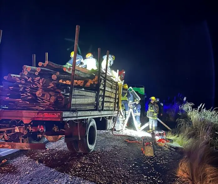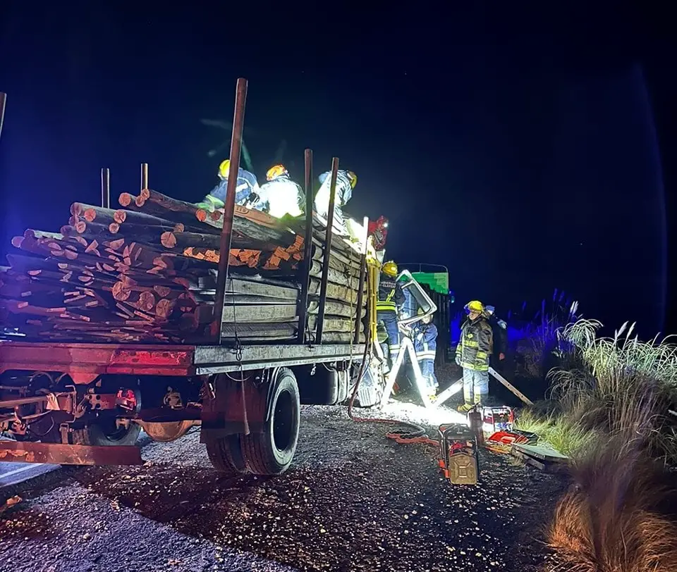 Un camión cargado con postes de manera, colisionó por alcance con la parte trasera de otro vehículo de gran porte. Como consecuencia del impacto, una pareja que viajaba en la cabina del camión quedó atrapada.