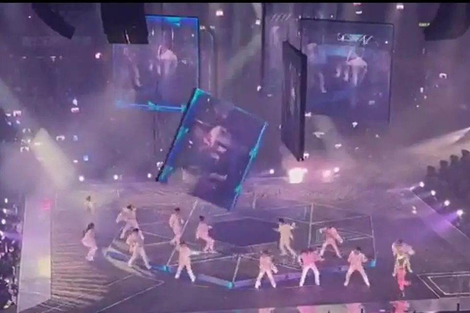 Una pantalla de video gigante cae sobre unos bailarines durante un concierto de la agrupación Mirror en Hong Kong 😮pic.twitter.com/GUxbWPt5zY
