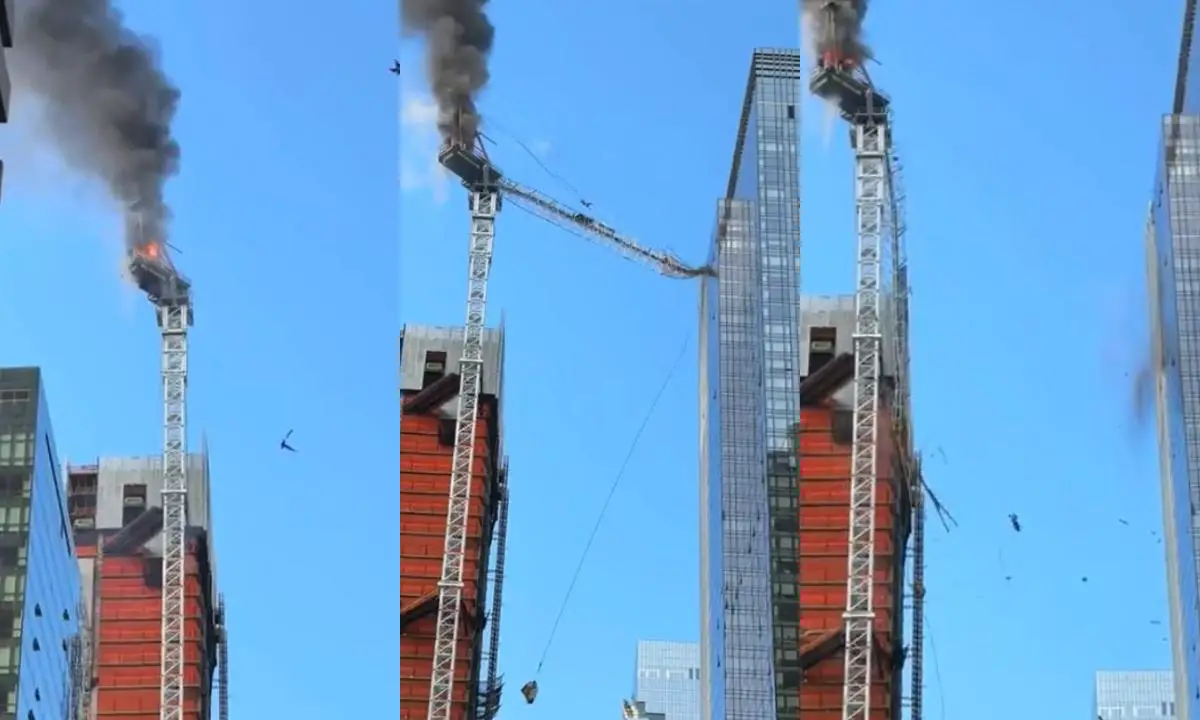 En las imágenes que rápidamente se viralizaron por todo el mundo, se ve el momento en el que el brazo de la grúa se desprende y, debido a su gran tamaño, al caer golpea con otro edificio que se ubica del otro lado de la calle.