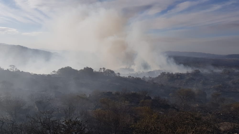 El principal foco de trabajo fue en campos ubicados entre Icho Cruz y Cuesta Blanca, en la zona del Criadero de Truchas, y el trabajo de los bomberos se hacía muy difícil por el intenso viento.