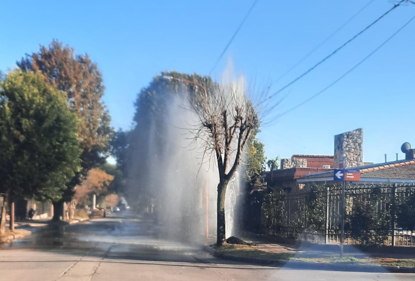 El incidente se registró en la esquina de Gobernador Garzón y Delfín Huergo, donde un caño roto generó un verdadero géiser urbano, con un chorro de agua que alcanzó casi los 10 metros de altura.