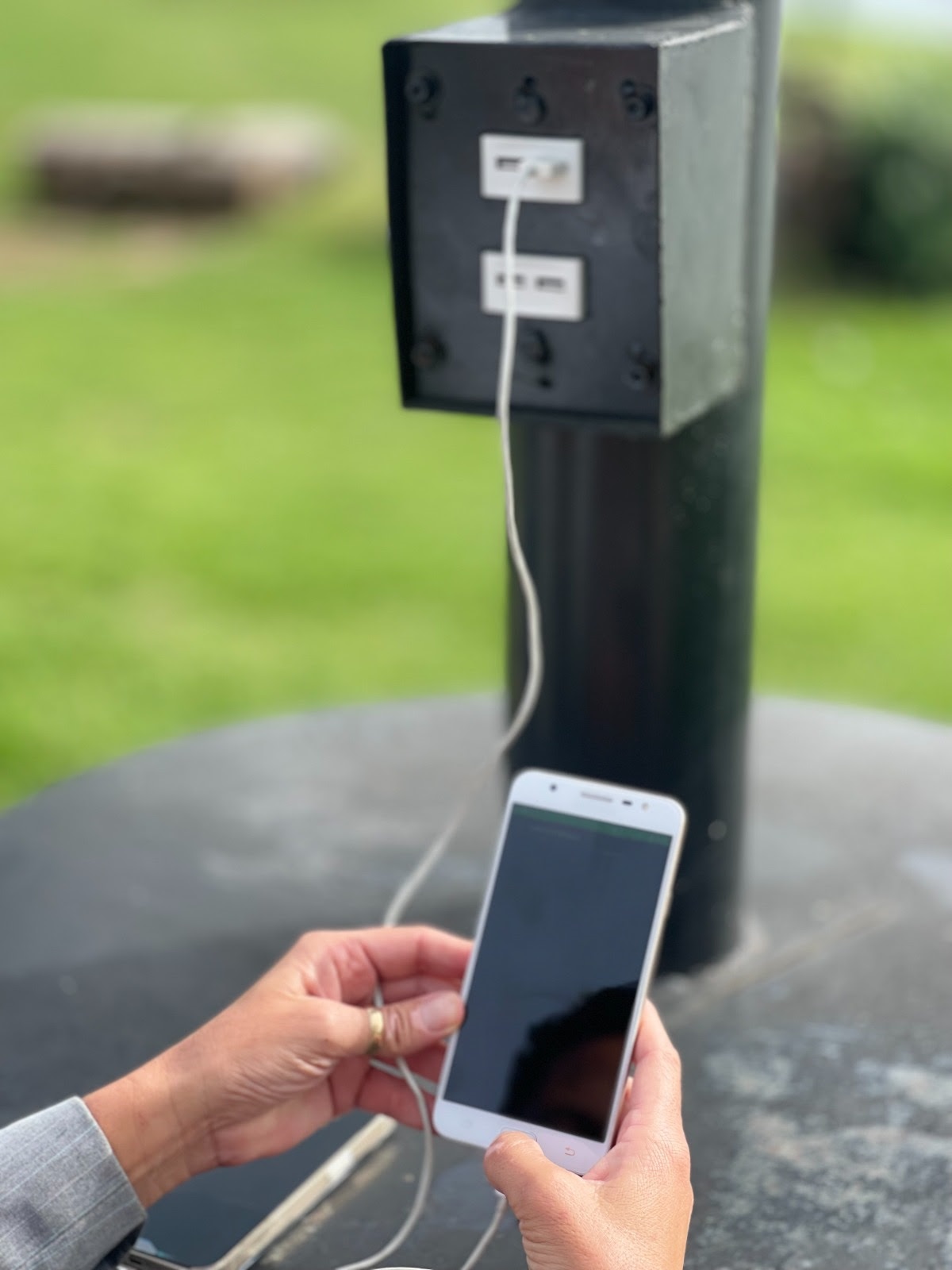 El punto cuenta con cuatro puertos usb que son alimentados por energía solar. Allí, el usuario podrá conectar el cable correspondiente a su teléfono y cargar su batería.