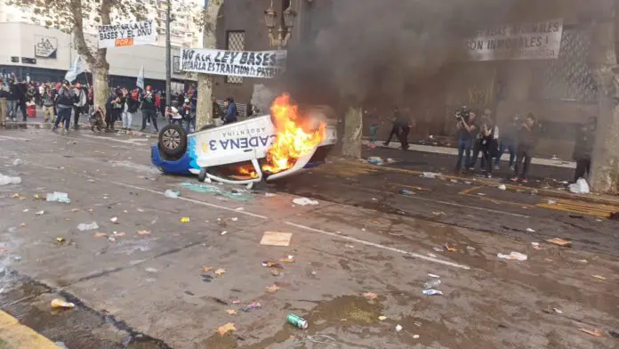 En medio de las manifestaciones que se concretaron en las calles cercanas al Congreso durante la tarde de este miércoles en rechazo al tratamiento del proyecto de ley Bases, un grupo de activistas dio vuelta un móvil de Cadena 3 y le prendió fuego.