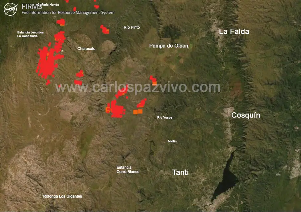 Este incendio ya pasó por los poblados de Canteras de Iguazú, Characato, Negro Huasi, Oro Grueso, Cañada Honda y Pampa de Olaen. Se incrementó anoche en la zona de Las Palmeras y Las Canteras del Cóndor y ahora avanza en dirección a Estancia La Candelaria. En la región siguen combatiendo las llamas más de 100 bomberos, con autobombas, camiones cisterna y kits forestales.