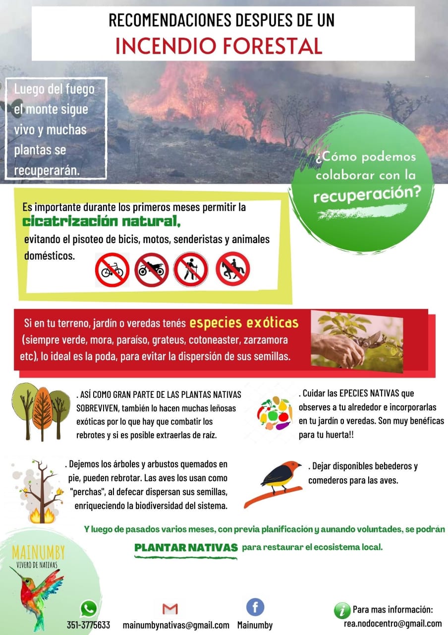 -En relación a la restauración de los ambientes afectados por los incendios, lo que principalmente se solicita a la población es tratar de no entrar en las áreas que han sido quemadas. No pisotear esos lugares porque en general los suelos quedan en condiciones bastantes frágiles, por eso no conviene hacer actividades en bicicleta, caminando y mucho menos en auto o vehículos motorizados. El bosque nativo tiene la capacidad para regenerarse ante un incendio. Su ecología de evolución está incorporando el factor incendio dentro de su ecología y conserva nutrientes en las raíces, que tienen la capacidad de sobrellevar un incendio y rebrotar. Por eso, cuando uno ve un incendio masivo forestal, cree que está todo perdido y hay que ir a reforestar como primera medida. Pero muchas veces, las especies nativas, sobre todo de estas zonas, tienen la capacidad de rebrotar ante un incendio. Lo que sí hay que tener mucho cuidado, es que no vuelva a ocurrir un incendio en ese lugar, por lo que hay que proteger al extremo la zona ya quemada, y que no se reitere un incendio en el sitio, en los próximos 10 años. Si se producen incendios reiterados, se van utilizando los nutrientes reservados en las raíces y va a llegar un momento que ya no va a haber más rebrotes.