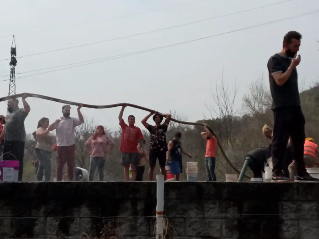 Desde una cirterna ubicada hacia el lado de la montaña, a metros del Polideportivo Municipal y de la estación transformadora de EPEC, más de una veintena de vecinos del sector formaron una columna humana y, con baldes, comenzaron a llevar agua hacia la zona de bosque que está próxima a las viviendas, porque un nuevo foco ígneo se desató en el sector y amenaza a las viviendas y sus moradores.