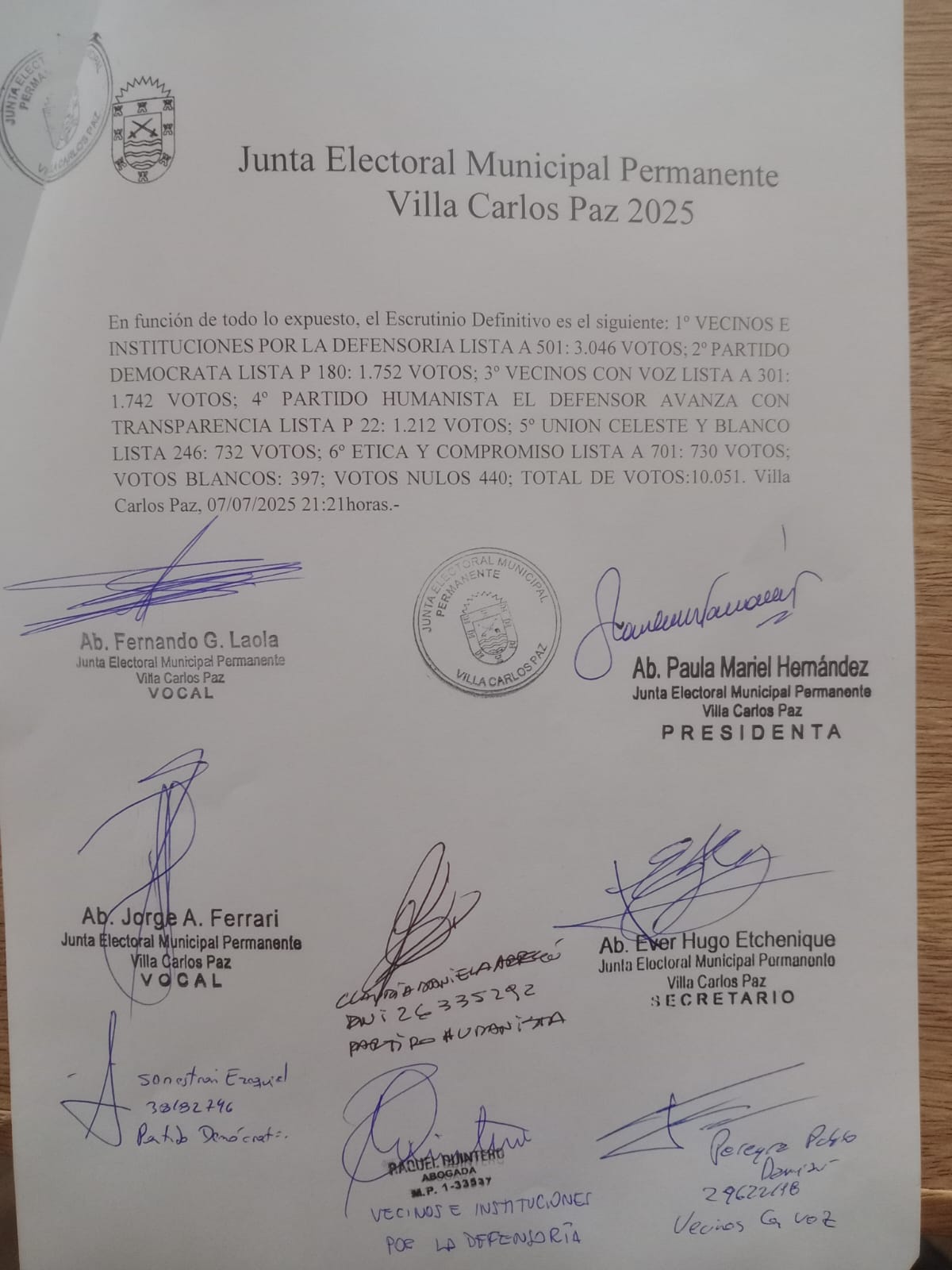 El escrutinio definitivo dejó como resultado a la agrupación “Vecinos e Instituciones por la Defensoría”, encabezada por Víctor Curvino, como ganadora con 3.046 votos. Le siguieron el Partido Demócrata (Jacinto D’Angelo, 1.752), Vecinos con Voz (María Ángela Mancuello, 1.742), Partido Humanista (Marcelo Iriarte, 1.212), Unión Celeste y Blanco (Santigo Juliá, 732) y Ética y Compromiso (Miriam Castellino, 730). Además, se registraron 397 votos en blanco y 440 nulos.