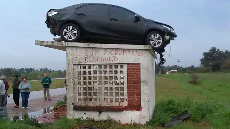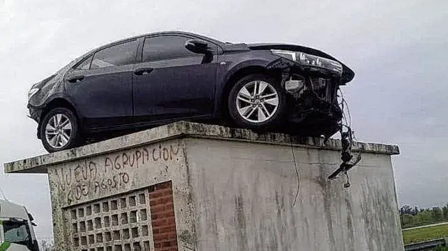 Un insólito hecho tuvo lugar esta mañana en la ruta 14, cerca de Colonia Hughes, Entre Ríos. Un automóvil Toyota Corolla se despistó sobre el camino y terminó sobre una garita de colectivo.