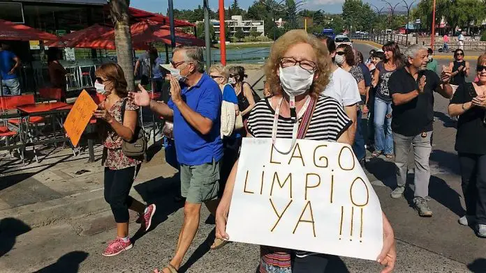“Intendente, cuidá el medio ambiente”, corearon los vecinos que marcharon con barbijos, máscaras antigas y carteles con mensajes sobre la contaminación del lago.