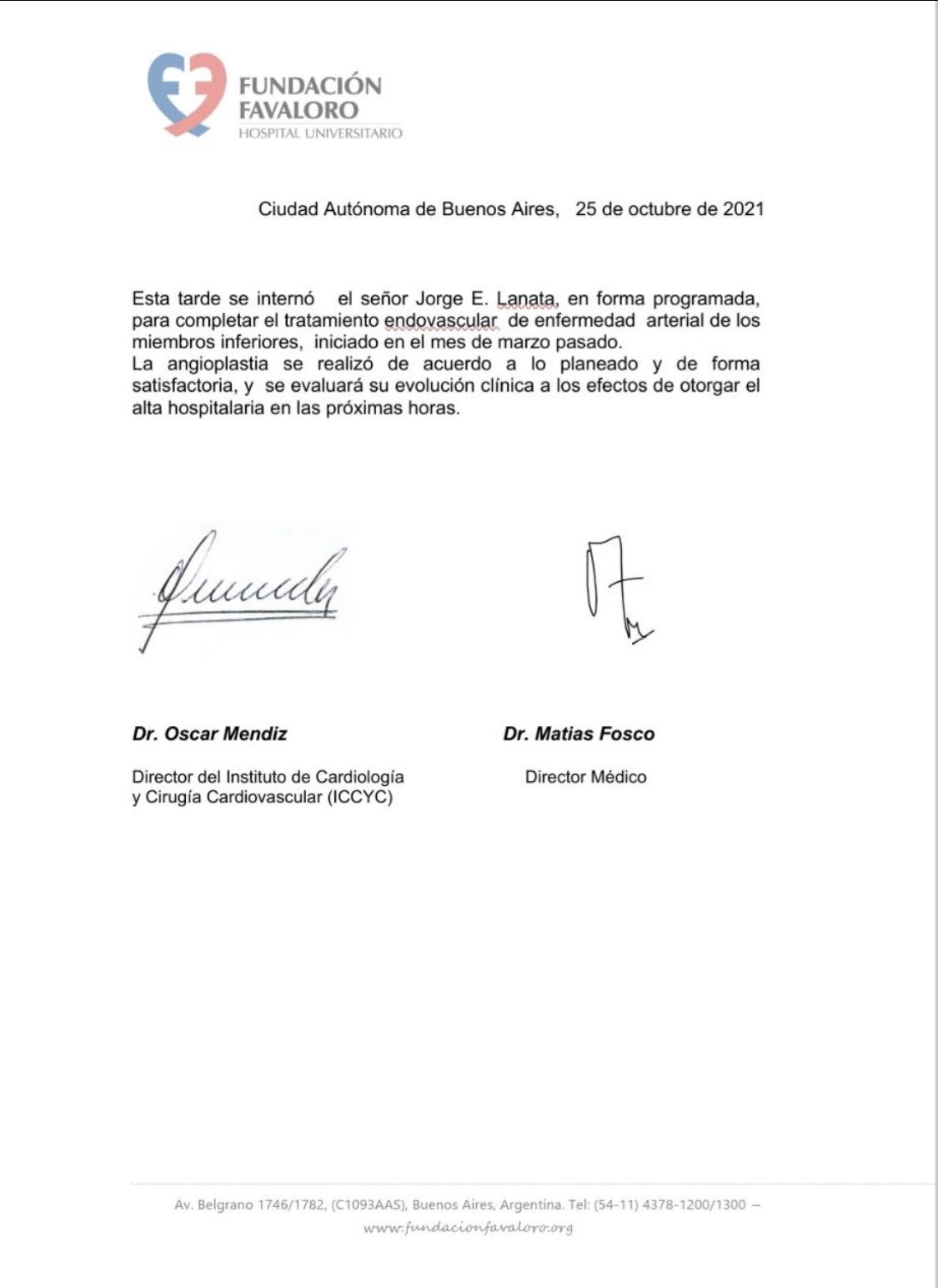 El nosocomio emitió un parte en el que consigna: “Se internó el señor Jorge E. Lanata, en forma programada, para completar el tratamiento endovascular de enfermedad arterial de los miembros inferiores, iniciado en marzo pasado. La angioplastía se realizó de acuerdo a lo planeado y de forma satisfactoria, y se evaluará su evolución clícina a los efectos de otorgar el alta hospitalaria en las próximas horas”.