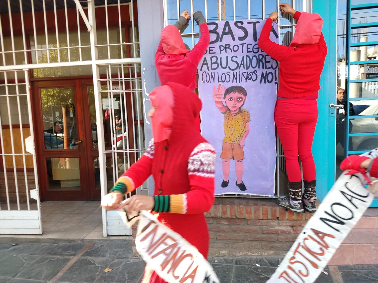 Una vez allí, vestidas de rojo y con los rostros tapados, interpretaron una melodía con una trompeta, luego leyeron un comunicado y finalmente colgaron carteles referentes al reclamo en las rejas del edificio de Justicia, los cuáles fueron retirados inmediatamente por la Policía.