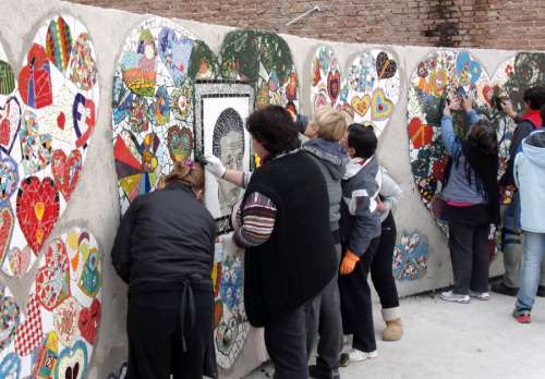 En nuestra ciudad se dispuso sobre una pared en la Plaza de los Artesanos donde se realizaron corazones a través de la técnica del mosaiquismo que fueron colocados en esta pared mural.