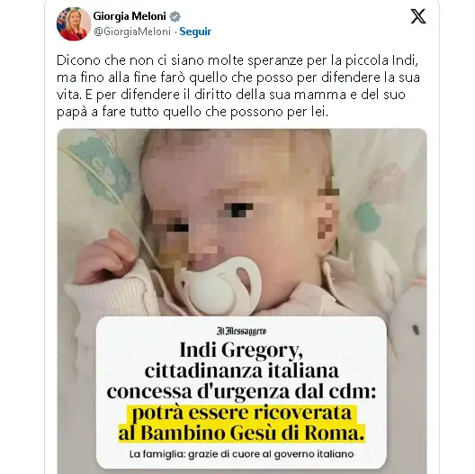 La ministra de Familia, Natalidad e Igualdad de Oportunidades, Eugenia Roccella, destacó en una publicación en su página de Facebook que «la vida y la muerte no son opciones equivalentes, y mucho menos pueden serlo para el Estado» y que «hacer de Indi nuestra conciudadana es la forma más eficaz de demostrarlo».
