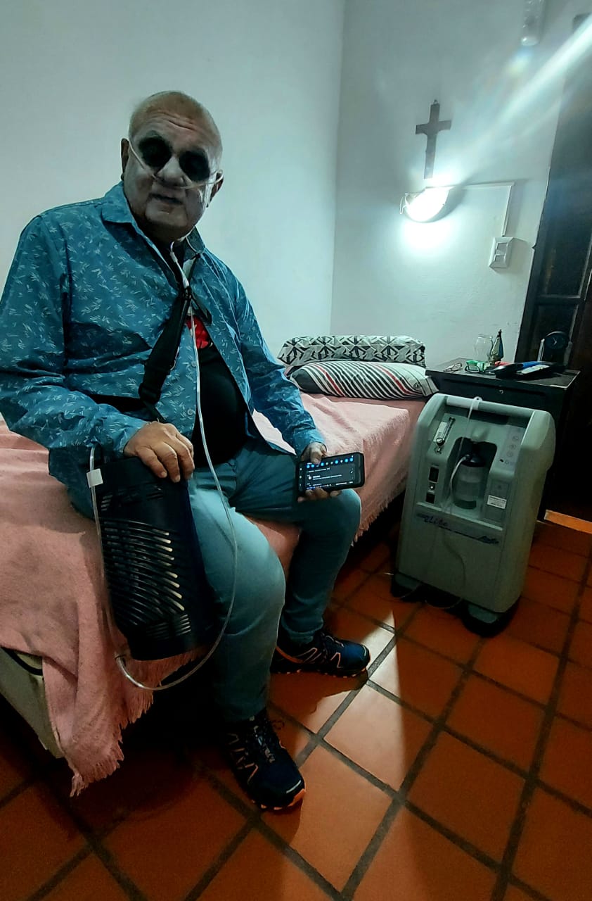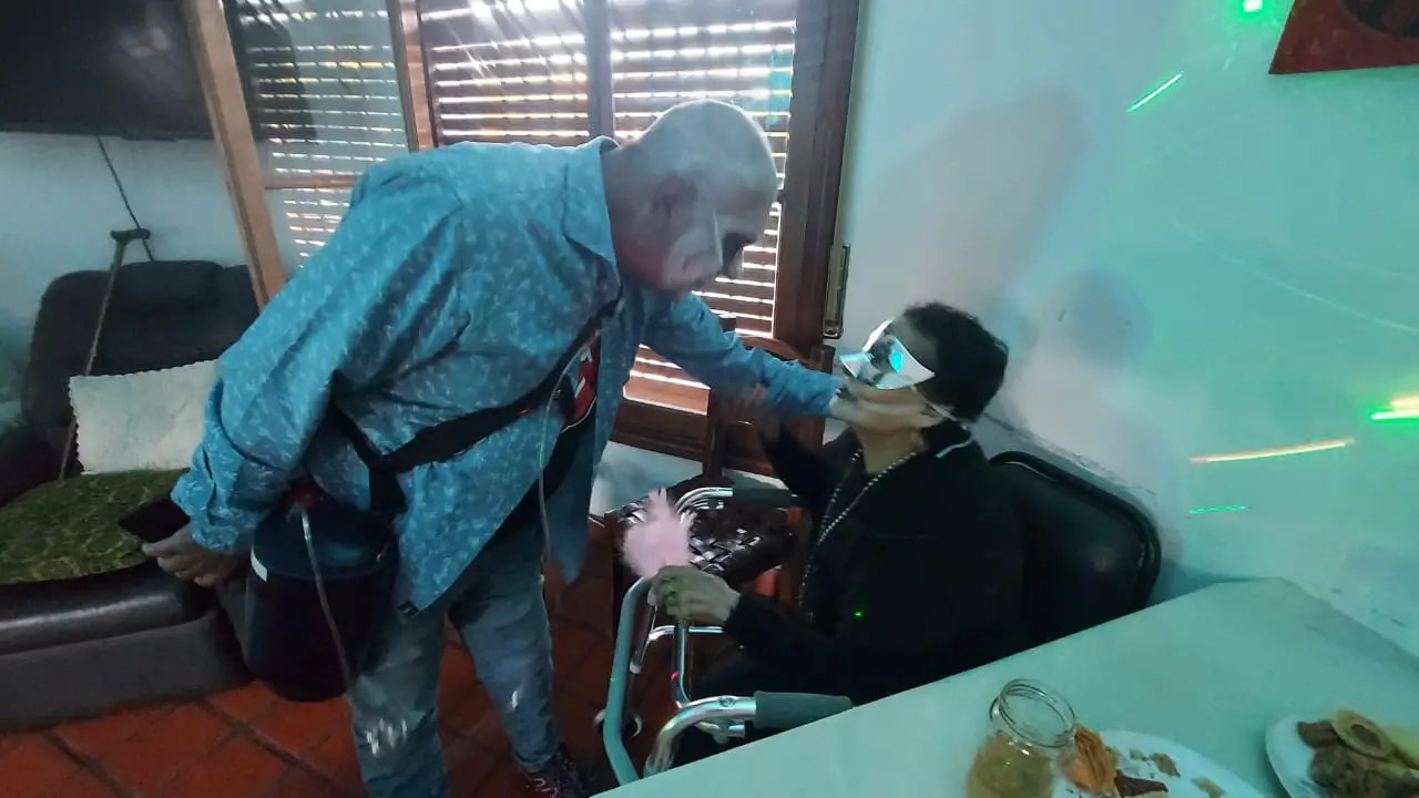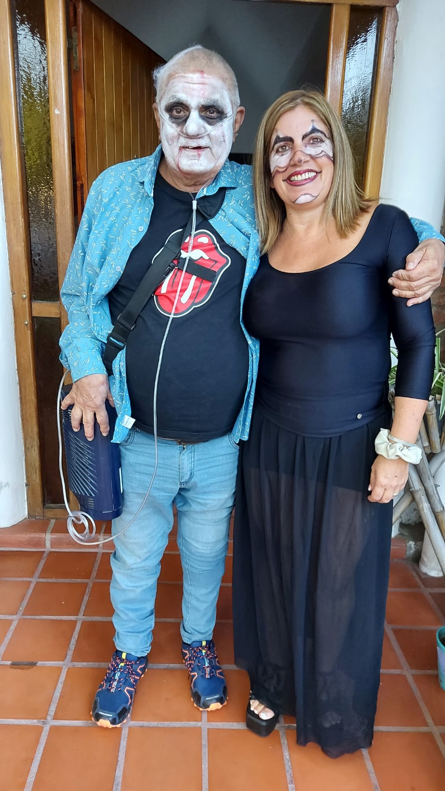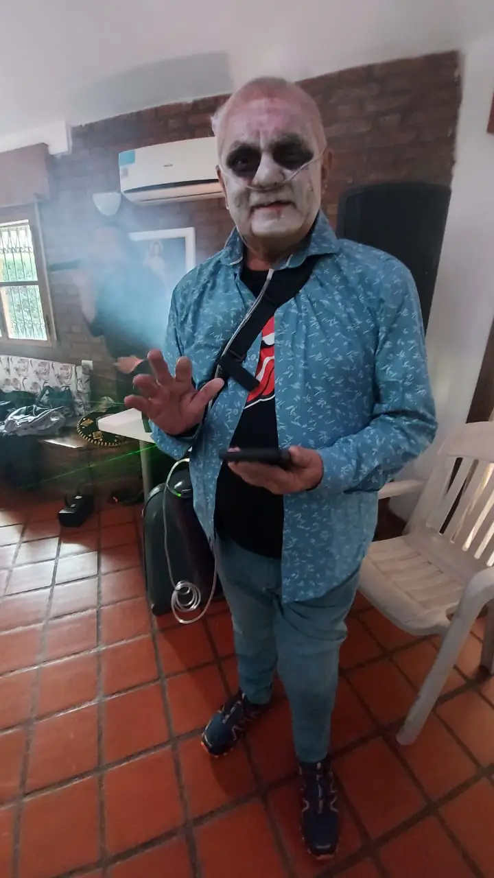 Disfrazado de zombi, de muerto/vivo, en su propio ‘Halloween’, organizado por El (¿alguien lo duda?) en la residencia geriátrica que lo contiene, por estos días, con su inseparable ‘mochilita de oxígeno’ (“mi nueva amiga, para siempre”) que lo ata a la Vida… a esa Vida que tanto ama y supo vivir al re mango.