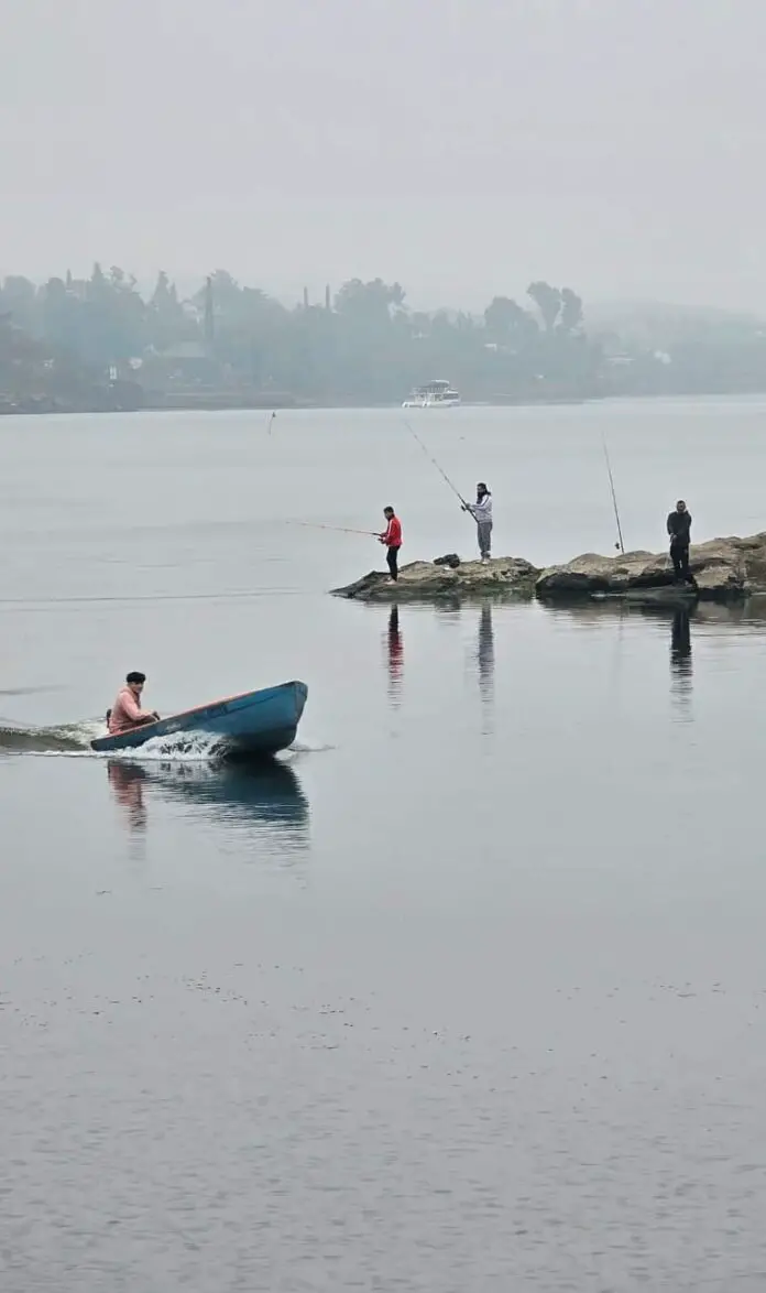 Pescadores que desafían todo, lancheros que surcan el lago, nubes que no se despegan de la tierra ni del agua hasta tarde… y Yo que me pregunto: ¿Qué carajo hago aquí en lugar de ir a buscar algo caliente y espirituoso (en ese orden)?!?