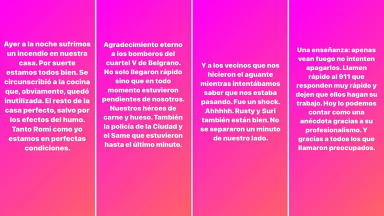 Los hechos fueron relatados por la pareja en sus cuentas de Instagram, que también agradecieron a los bomberos que trabajaron en el lugar: “No solo llegaron rápido sino que que en todo momento estuvieron pendientes de nosotros. Nuestros héroes de carne y hueso”, destacó Rial.