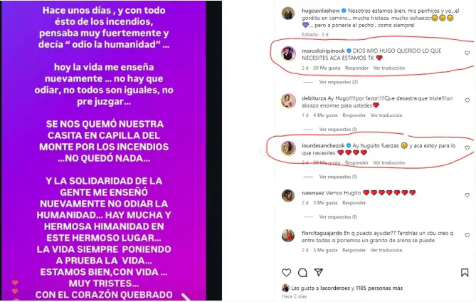 En diálogo con Pronto, Moliniers expresó entre lágrimas: “Lastimosamente, se quemó todo. Habíamos terminado de pagar la casa hacía dos semanas y ahora solo quedan cenizas. No tuvimos tiempo de sacar nada; el viento cambió el rumbo del fuego y Hugo tuvo que huir con los perritos”.