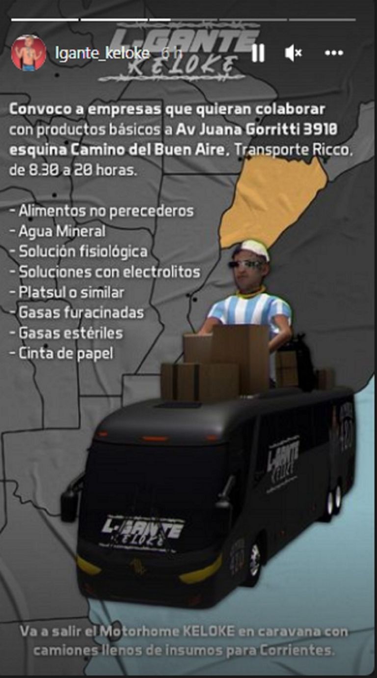 En dicha publicación solicitó desde agua mineral, alimentos no perecederos, gasas, solución fisiológica, entre otros elementos. Sin embargo, lo que llamó la atención es que el nuevo vehículo del artista irá en una caravana con estas donaciones hacia el destino correntino. “Va a salir el motorhome Keloke”, escribió el músico.
