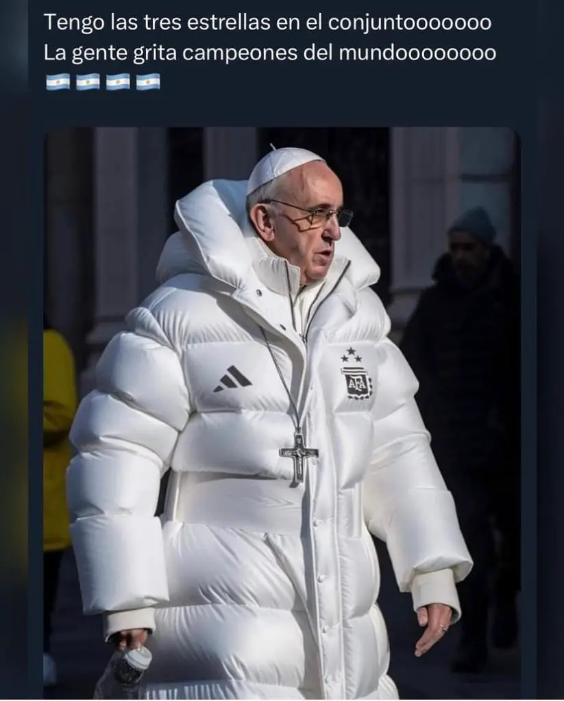 En este caso la campera existe, el papa con la campera no. Llama tanto la atención el look creado por medio de la IA que los memes inundaron las redes con situaciones en que ubican al Papa en situaciones mas dignas de un trapero que del representante de la iglesia católica.