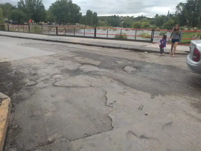 Ayer, tras el paso de la creciente y las lluvias por el sector, el puente volvió a romperse en su superficie, dejando al descubierto una serie de pozos por donde se hace difícil transitar.