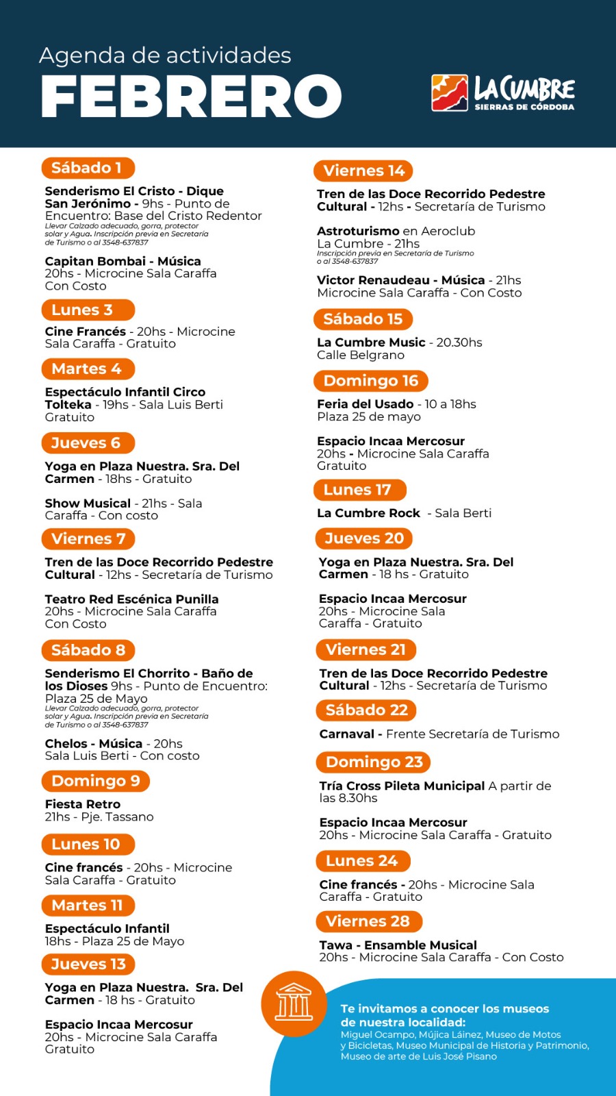 Asimismo, en el mes de febrero, La Cumbre organiza una diversidad de actividades culturales para todos los gustos y edades. Muchos de ellos con entrada gratuita. A continuación, la grilla: