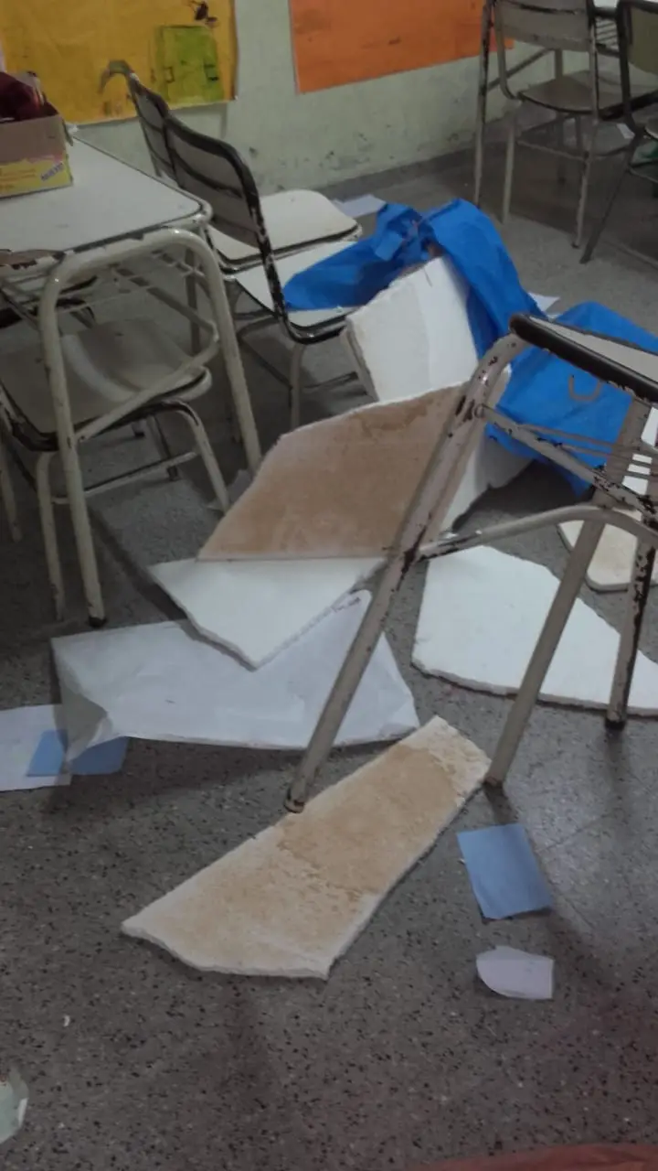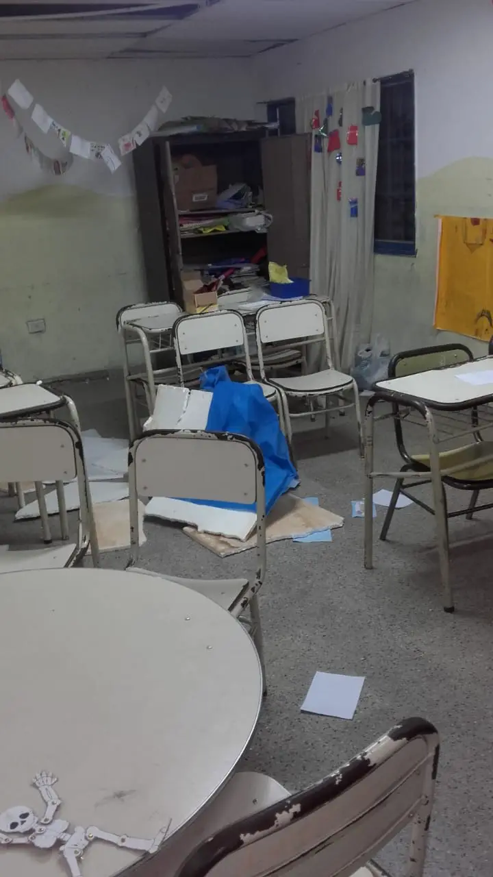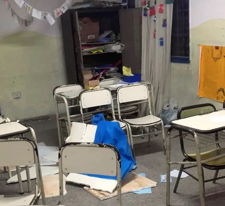 En el interior de la escuela, los vándalos rompieron, bancos, sillas, mesas, cielorasos, escritorios, desparramaron y rompieron libros y estanterías entre otras cosas.