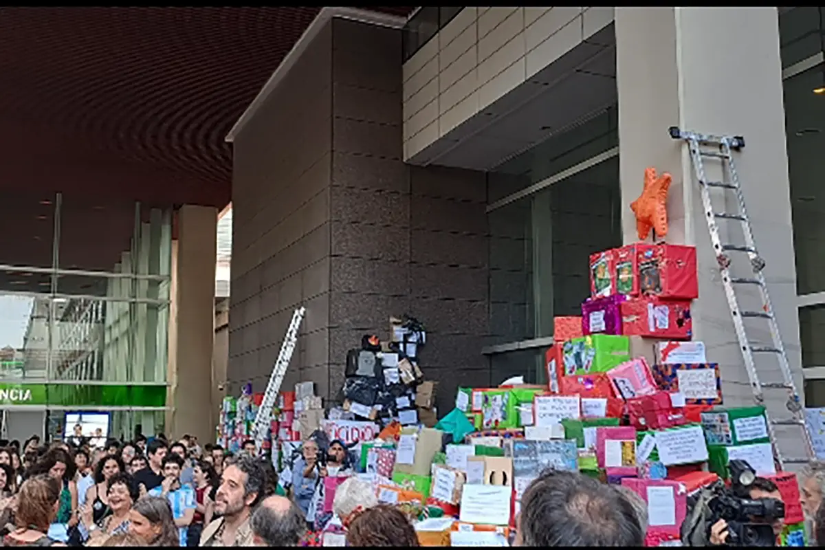 La estructura fue armada con cientos de cajas apiladas que contenían mensajes y deseos por el futuro de la ciencia en Argentina, junto con consignas de crítica a los recortes presupuestarios que atraviesa el sector. Bajo la consigna “Navidad con ciencia”, la comunidad científica buscó visibilizar sus demandas mientras recuperaba, con humor e ironía, uno de los hitos divulgativos más comentados del año.