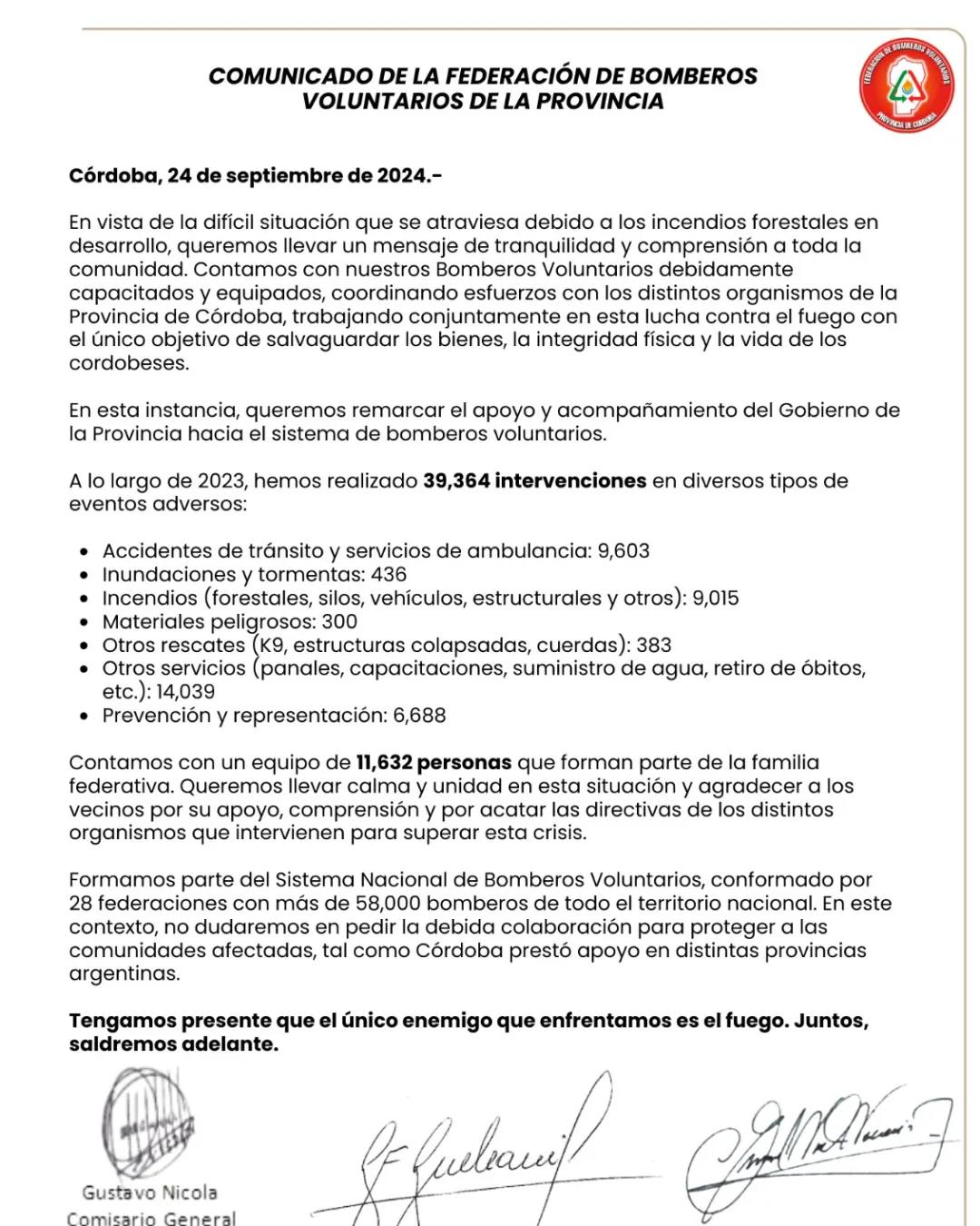 En medio de la crítica situación que atraviesa la provincia debido a los incendios forestales, la Federación de Bomberos Voluntarios de Córdoba emitió un comunicado oficial en el que expresó su apoyo y agradecimiento al Gobierno provincial por su colaboración y respaldo al sistema de bomberos voluntarios.