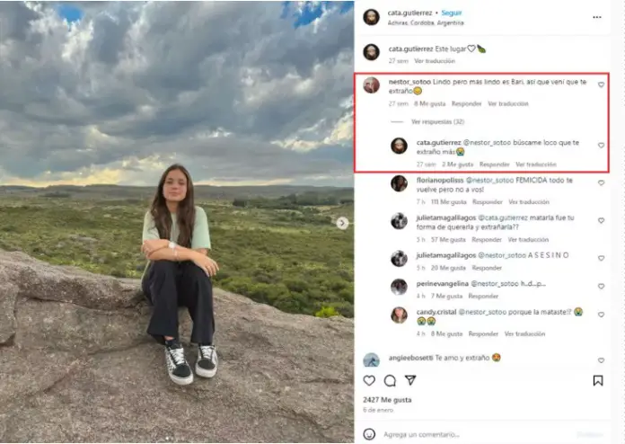 En esa oportunidad, el acusado de asesinato comentó la imagen. “Lindo, pero más lindo es Bari, así que vení que te extraño”, escribió el joven junto al emoji de una cara triste. “Bari” hace referencia a Bariloche, de donde es oriundo Néstor. Su compañera de estudios le respondió: “Buscame loco, que te extraño más”.